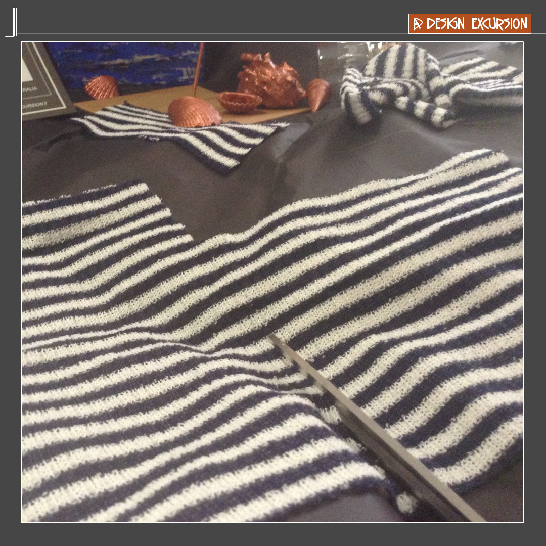 We cut some fabric to portray a beach towel. The navy blue and white stripe reflects a nautical theme.